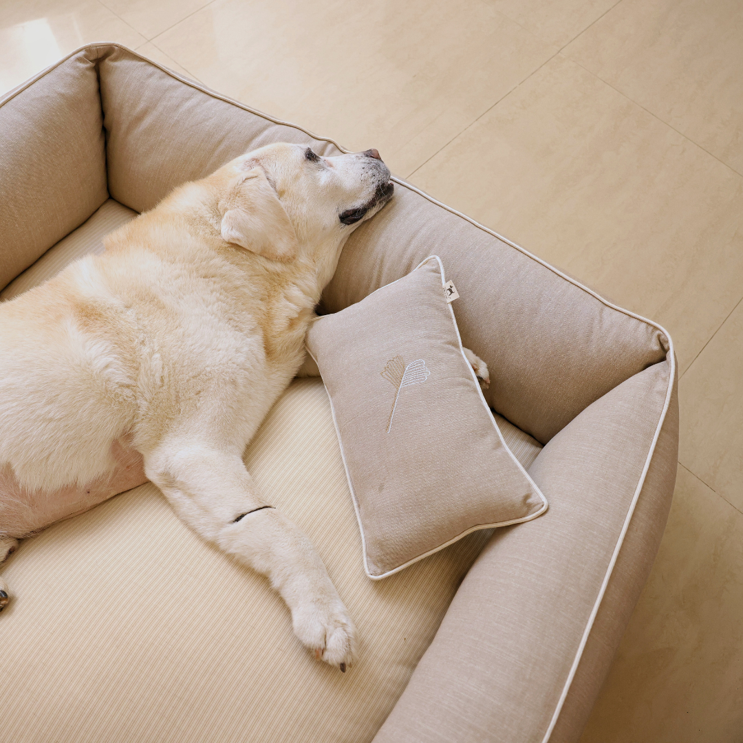 PoochMate Beige & Ivory Linen Dog Bed is made with thick linen bolsters and a 100% cotton seat with beige & ivory stripes.