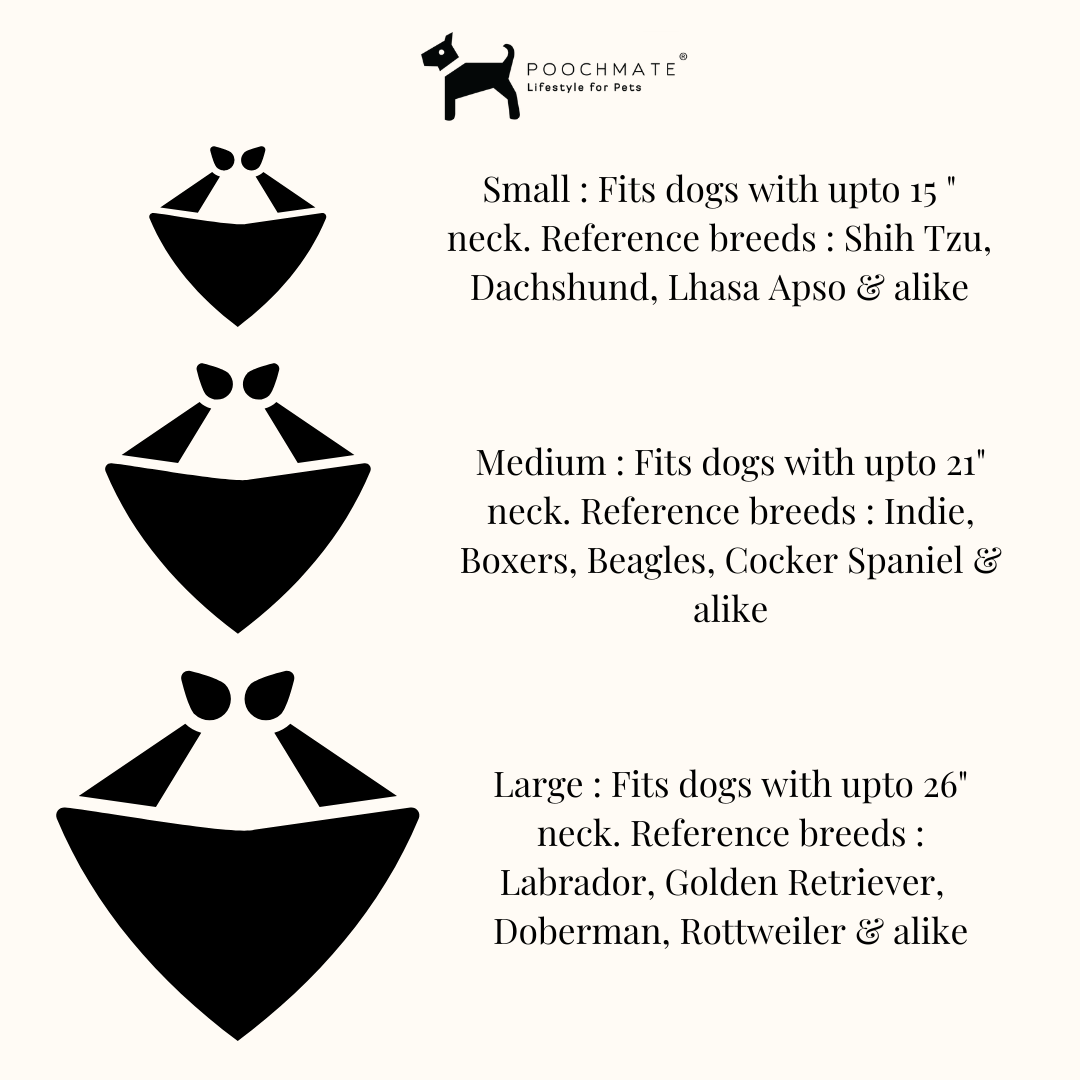 - Dog bandana comes in a matching fabric in 3 sizes to suit all dogs. Tie ends around your dog's neck to adjust the size.